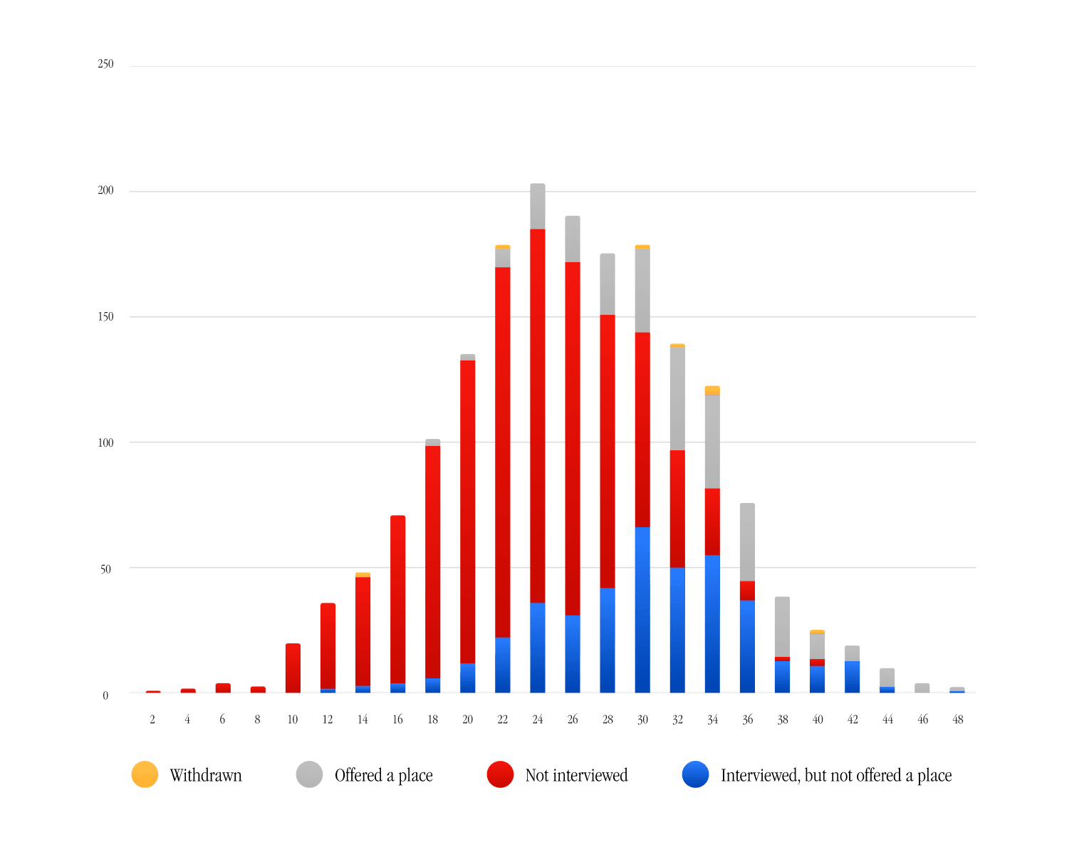 With applicants coming from different curriculums worldwide, admissions tests are the most reliable benchmark. They’re also a strong predictor of success. Oxford’s TSA data shows applicants scoring above 34 are almost always invited to interview.
